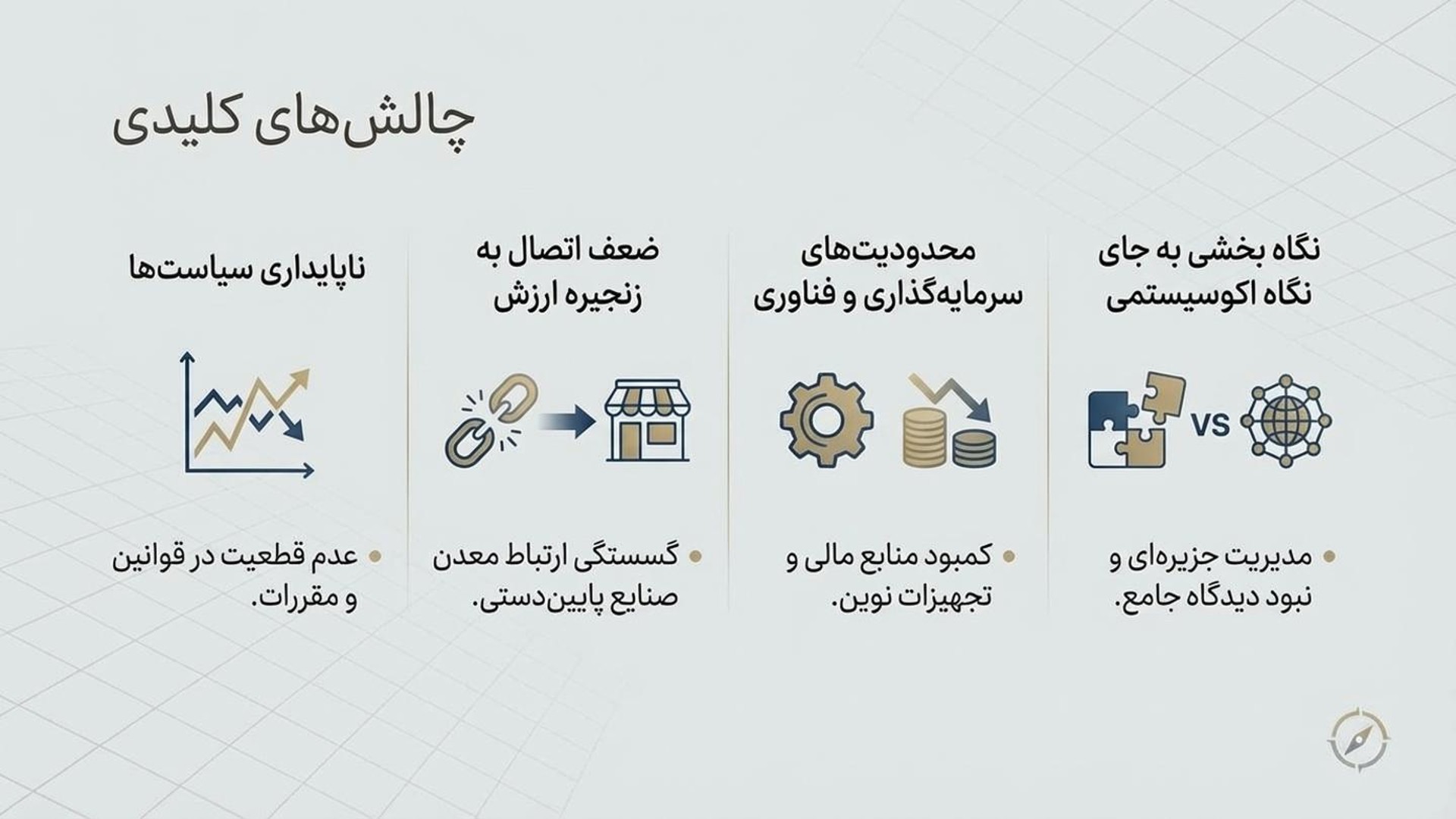 - افزایش امنیت زنجیره تأمین: دسترسی پایدار به مواد معدنی، صنایع مادر را از وابستگی به واردات محافظت میکند
